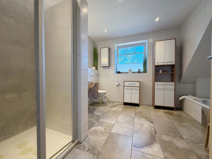 Die hochwertige Ausstattung umfasst unter anderem dreifach verglaste Kunststofffenster mit Sicherheitspaket, elektrische Rollläden. Eine Fußbodenerwärmung mit Heizkörpern sorgt in allen Wohnbereichen für behagliche Wärme.
