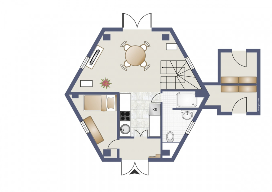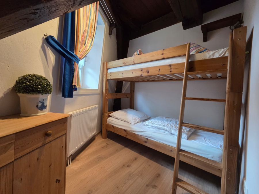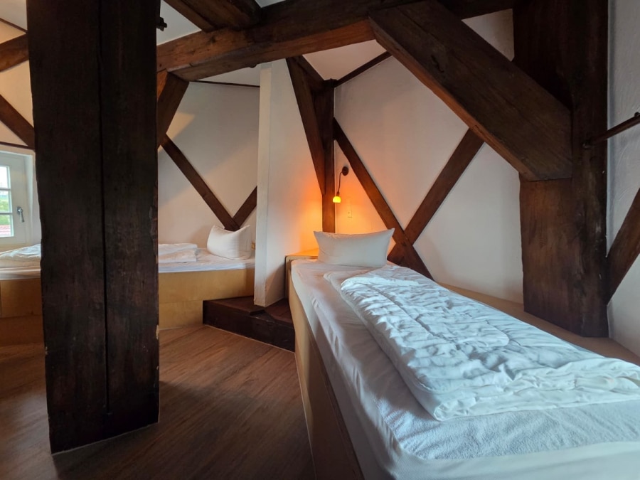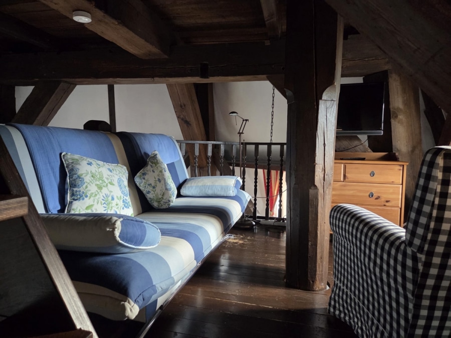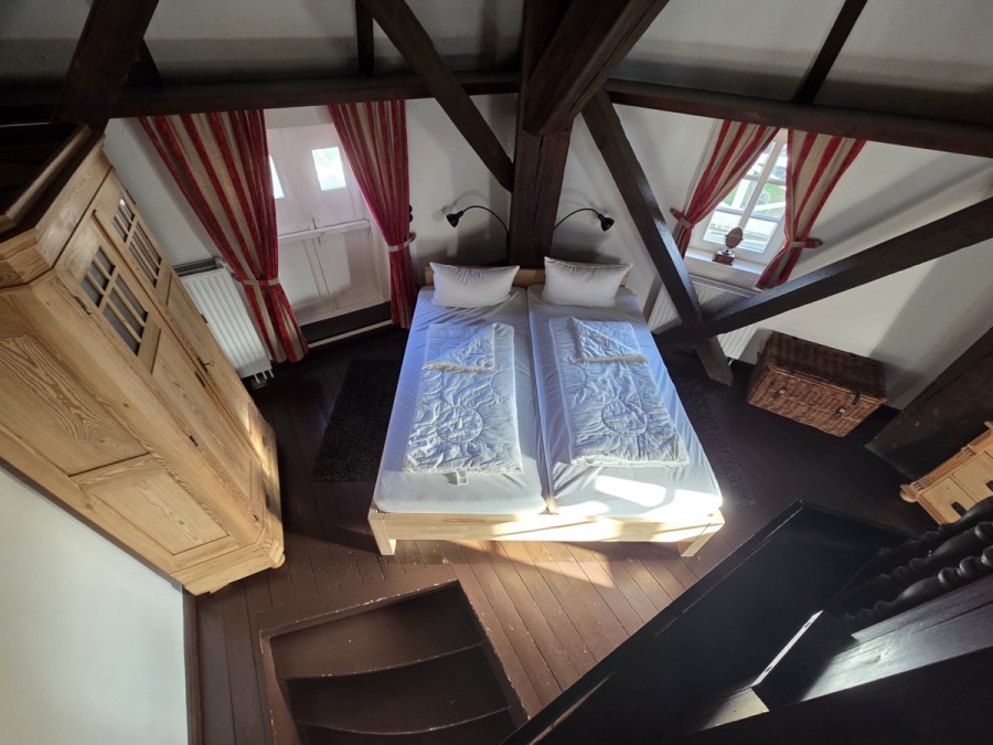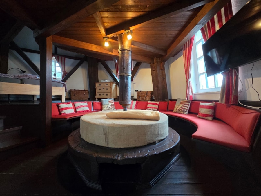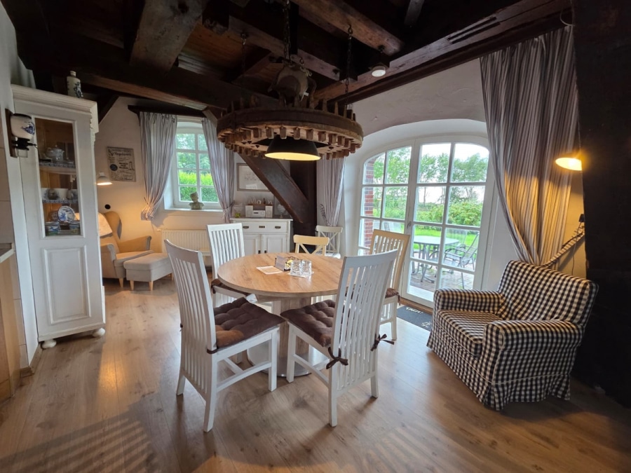 Die Mühle bietet rund 100 Quadratmeter Wohnfläche, verteilt auf vier Etagen. Gewaltige Holzbalken, ein alter Mühlstein, der als Tisch umfunktioniert wurde, sowie viele stilvolle Details schaffen ein einmaliges Ambiente. Drei Schlafzimmer, zwei moderne Bäder, gemütliche Wohnbereiche und eine voll ausgestattete Küche machen das Wohnen hier komfortabel und praktisch zugleich. Auf der Terrasse mit Strandkorb und im angrenzenden Garten genießen Sie entspannte Stunden in maritimer Umgebung.