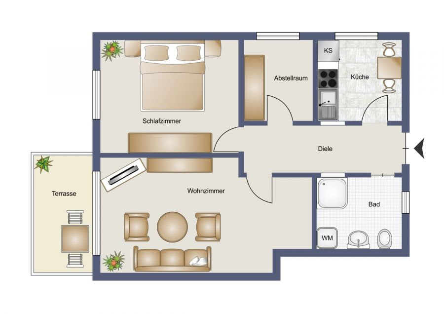 Wohnzimmer, Küche, Schlafzimmer, Duschbad mit Waschmaschinenanschluss, Abstellraum, Flur