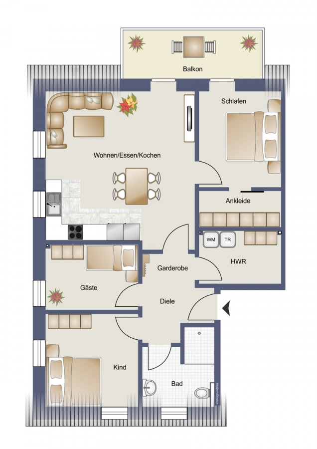 Auf ca. 95,63 m² Wohnfläche verteilen sich eine lichtdurchflutete, offene Wohnküche mit Zugang zum Balkon, drei gemütliche Schlafzimmer, ein Tageslichtbad mit bodengleicher Dusche sowie ein praktischer Abstellraum mit Waschmaschinenanschluss und ausreichend Platz für einen Trockner. Eine moderne Einbauküche ist bereits vorhanden und fügt sich harmonisch in den Wohnbereich ein.